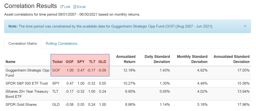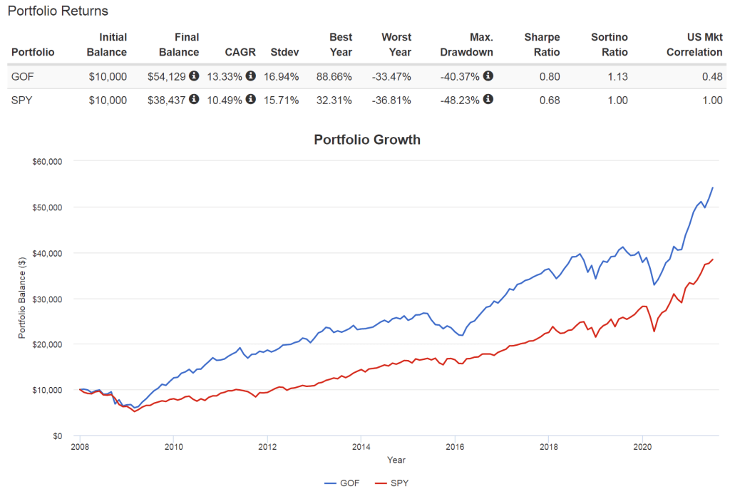 下圖總結了 GOF 自 2008 年成立以來與以 SPY 為代表的整體市場相比的表現。 可以看出,GOF 在此期間的整體總回報率為 13.3% 的複合年增長率,大大超過通脹 SPY (複合年增長率約為 3%)。如此壯觀的結果是由於兩個相當幸運的因素的結合。首先是基金的幸運成立時間。基金成立後不久,市場就經歷了持續十多年的牛市。第二個因素是槓桿。在上漲的市場中,槓桿只會放大回報。