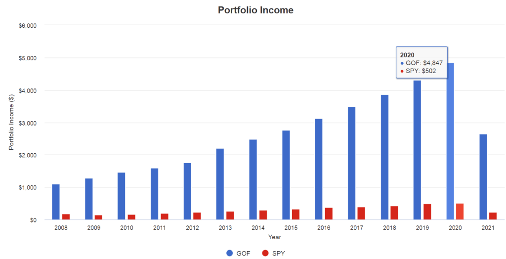 接下來的兩個圖表側重於其股息 - 其目標的另一半。如圖所示,GOF 確實提供了明顯高於整體市場的股息收入。其目前的股息收益率約為 10.4%,而 SPY 的股息收益率約為 1.4%。而且紅利一直在增長。模擬假設股息再投資。可以看出,通過股息再投資,該基金現在產生的股息收入幾乎是 SPY 提供的股息收入的 10 倍。